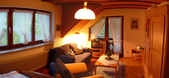 Kleine Ferienwohnung Wiesenblick Typ A Diese Ferienwohnung eignet sich für 2-3 Personen. Die 45 qm große Wohnung bietet eine kleine Küche sowie einen separaten Balkon. Sat-TV Wohn-Schlaf bereich